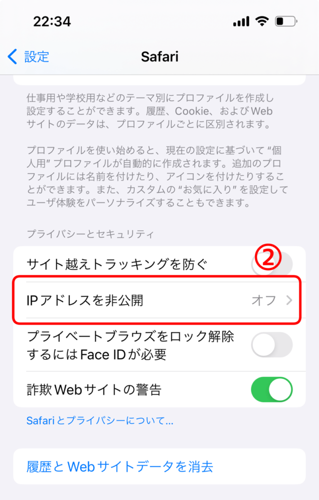 3、「IPアドレスを非公開」と選択しオフをタップする。